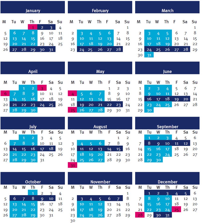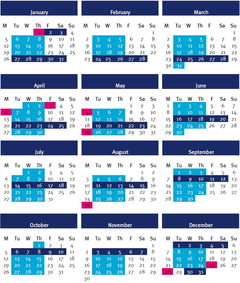 Longer weeks - Dark blue Shorter weeks - Light blue Bank holidays - Pink (Closed)